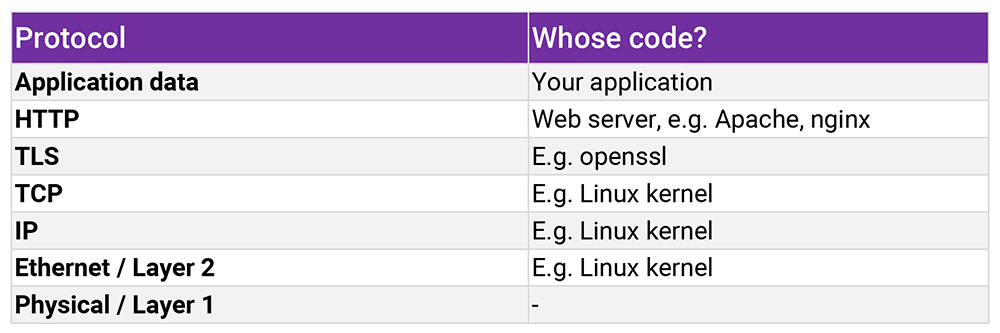 IP networking has a somewhat simplified set of layers, but again, it’s not a perfect model. Protocols like ARP and TLS don’t fit neatly into the model. The main thing to remember is that protocols always happen in layers, and typically different pieces of software are responsible for each layer.